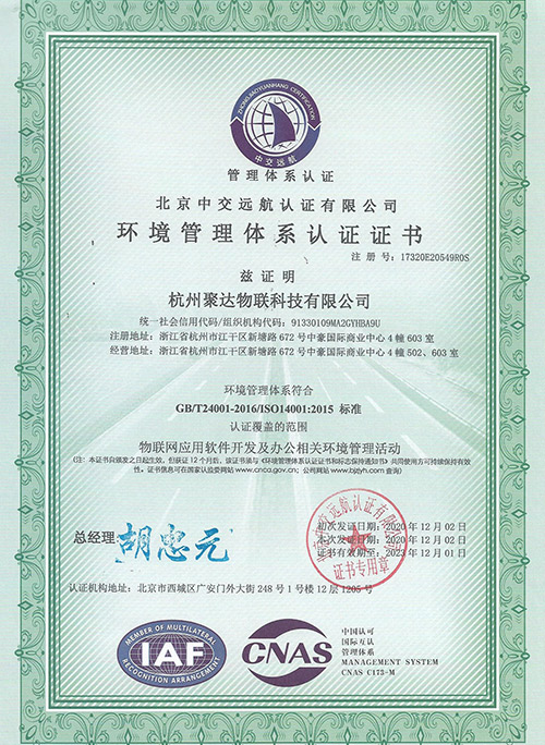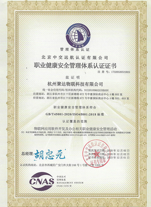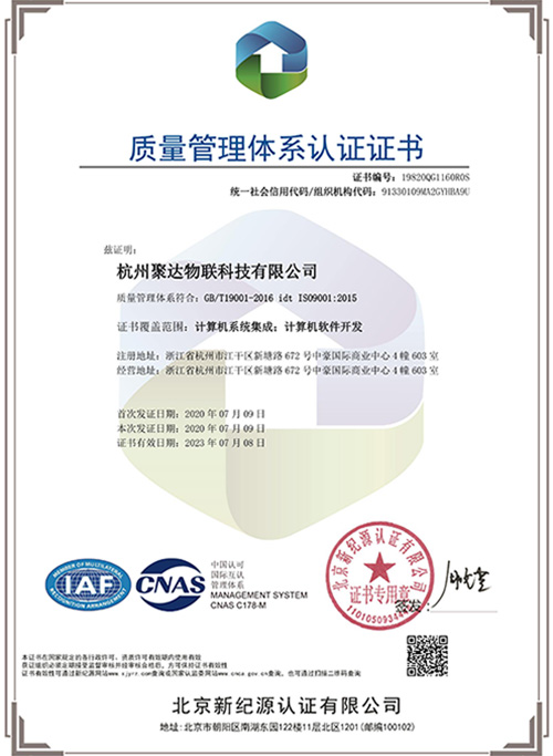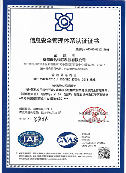 聚達物聯科技已榮獲多項權威認證證書,包括ISO9001質量管理體系認證、ISO27001信息安全管理體系認證、職業健康安全管理體系認證證書、環境管理體系認證證書。