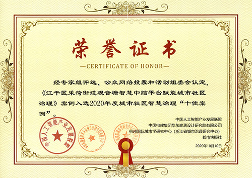 聚達物聯科技打造的江干區采荷街道觀音塘智慧中腦平臺案例入選2020年度城市社區智慧治理“十佳案例”。