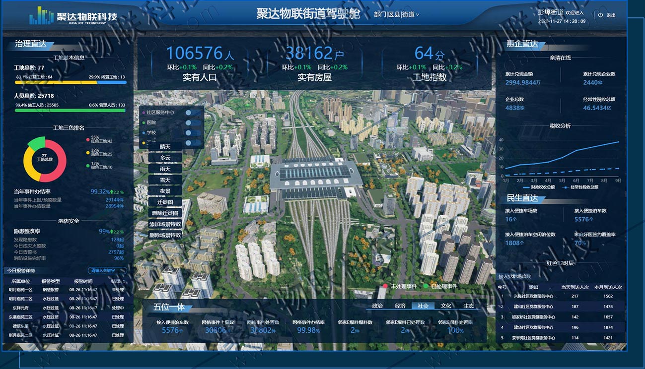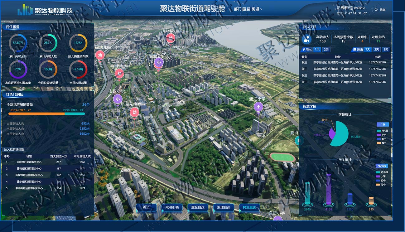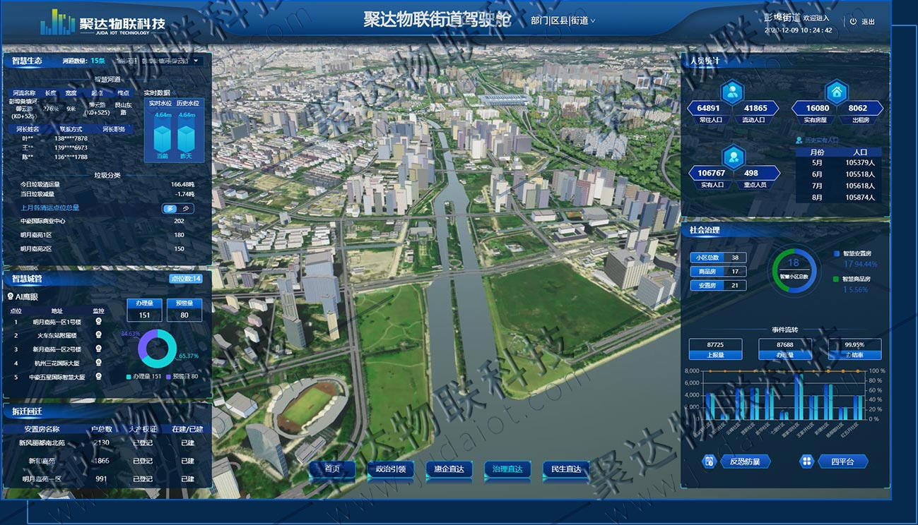 智慧社區平臺是聚達物聯科技歷時多年潛心研發的基于物理模型、傳感器、運行歷史等數據,集成多學科、多物理量、多尺度、多概率的仿真過程的數據管理平臺,實現平臺數據在虛擬空間中完成映射,從而解決傳統社區中人員管理、車輛管理、應急安全、消防安全、流轉事件等方面存在的突出問題,將社區居委會、物業公司、居民和各種智慧系統形成各種形式的信息交互,實現高效、有序、可控、安全、智能的社區管控總體目標,推動傳統社區向智慧社區轉變。